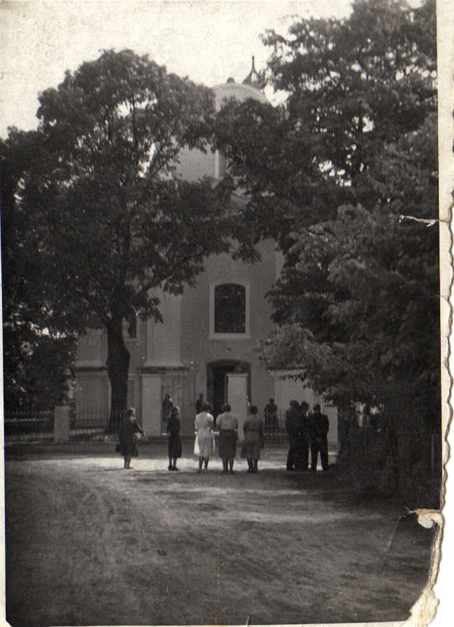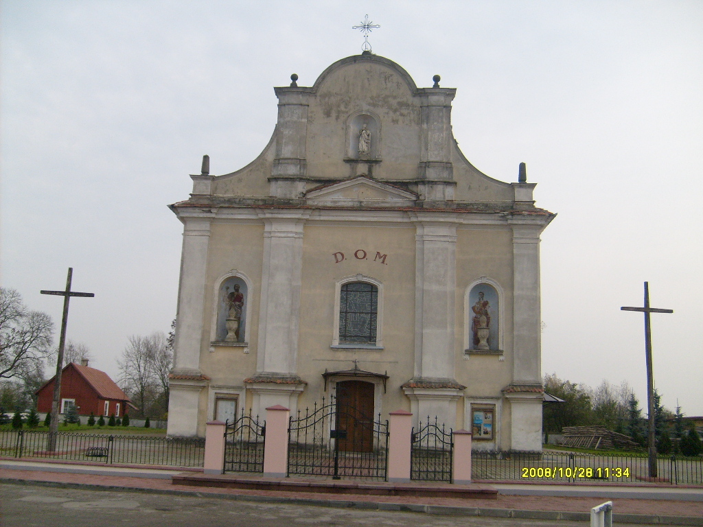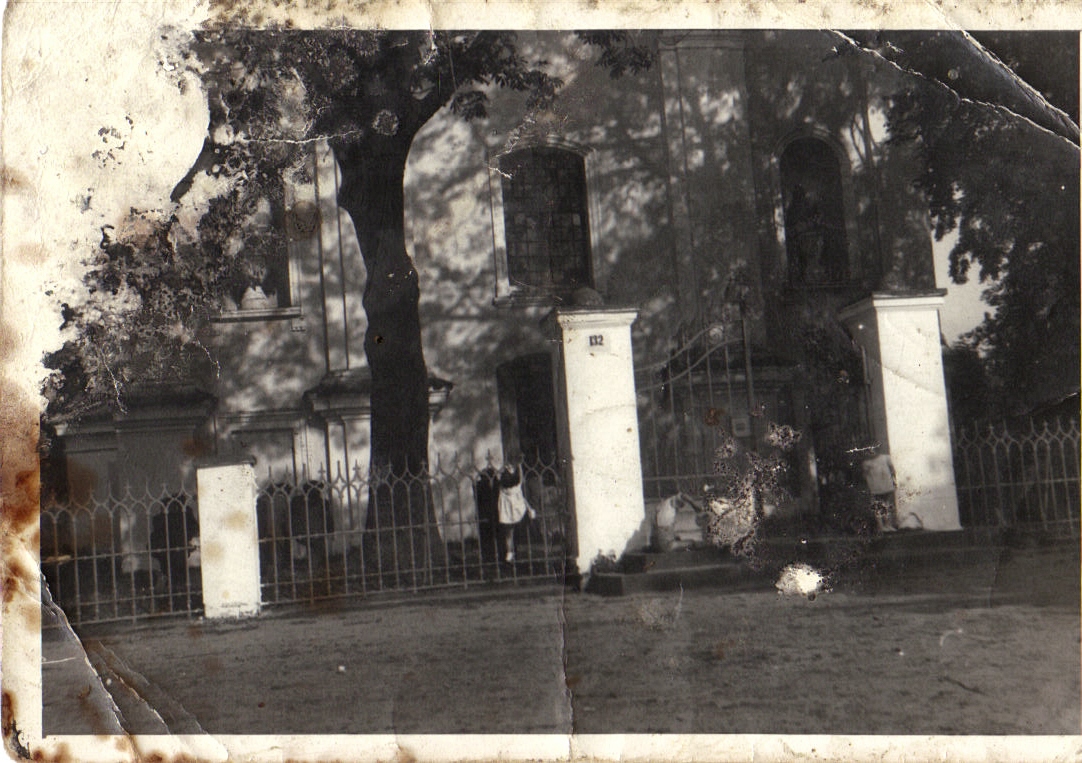 - Fasada kościoła p.w. św. Wawrzyńca.W niszach widoczne malowidła św. Piotra i Pawła. Przed renowacją.