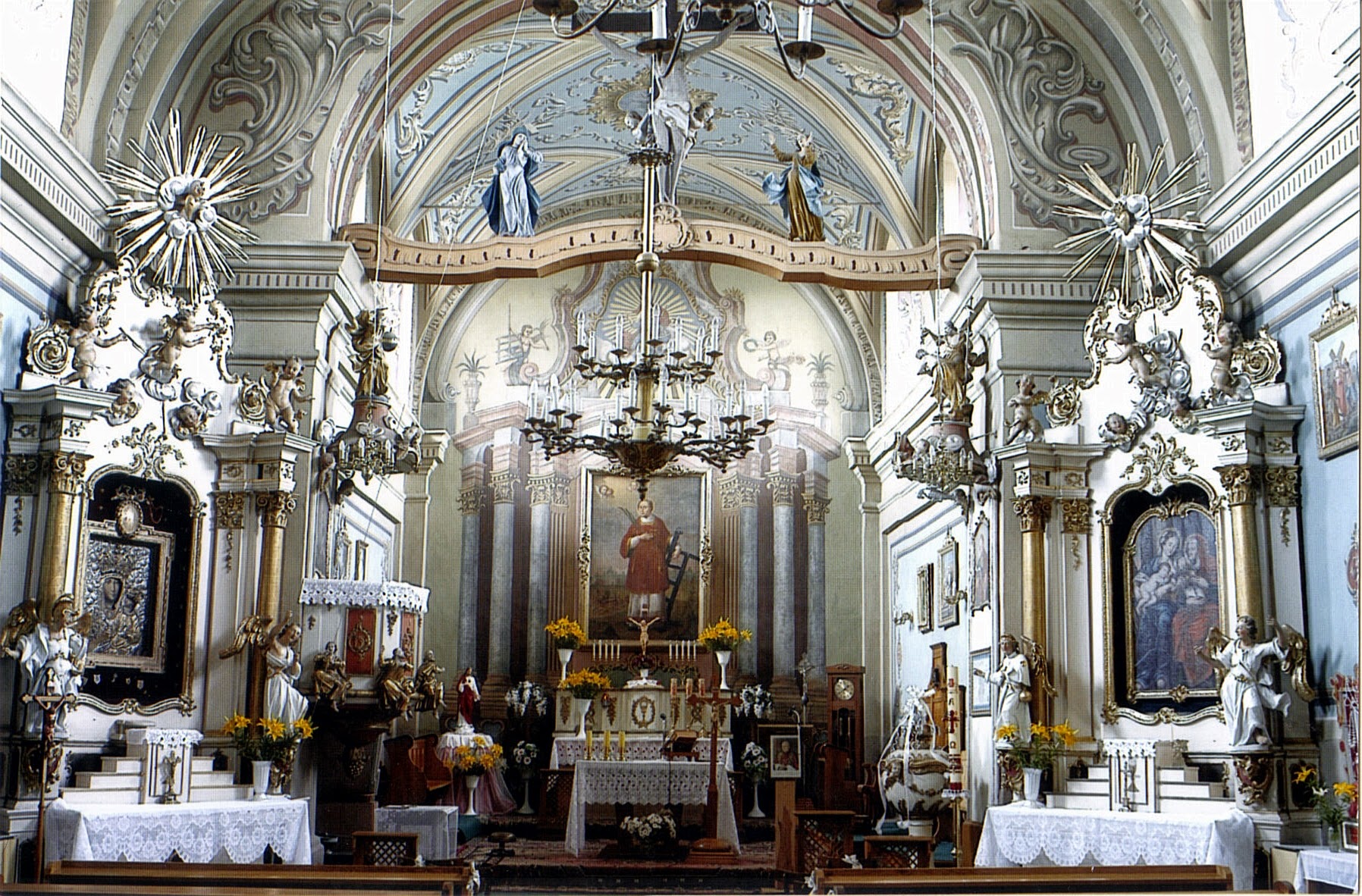 - Wnętrze kościoła dawniej, widoczne na pierwszym planie przepiękne balaski i wyższy ołtarz zasłaniający obraz św Wawrzyńca.