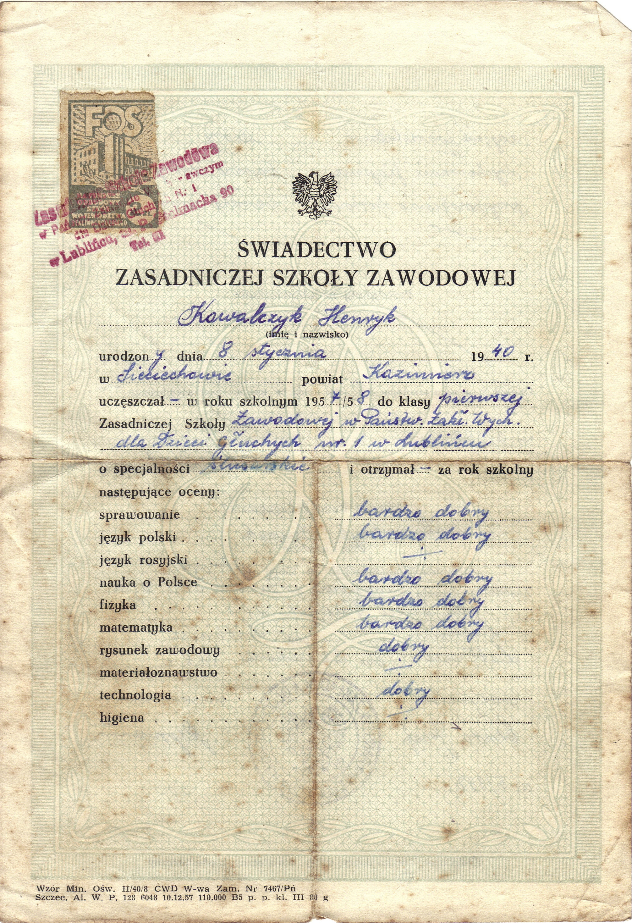 - Henryk Kowalczyk świadectwo Szkoła Zawodowa