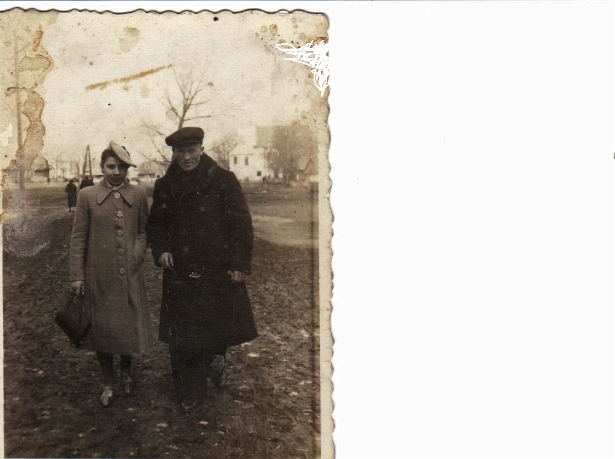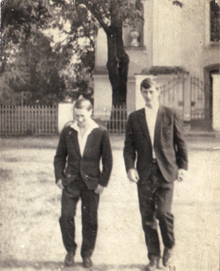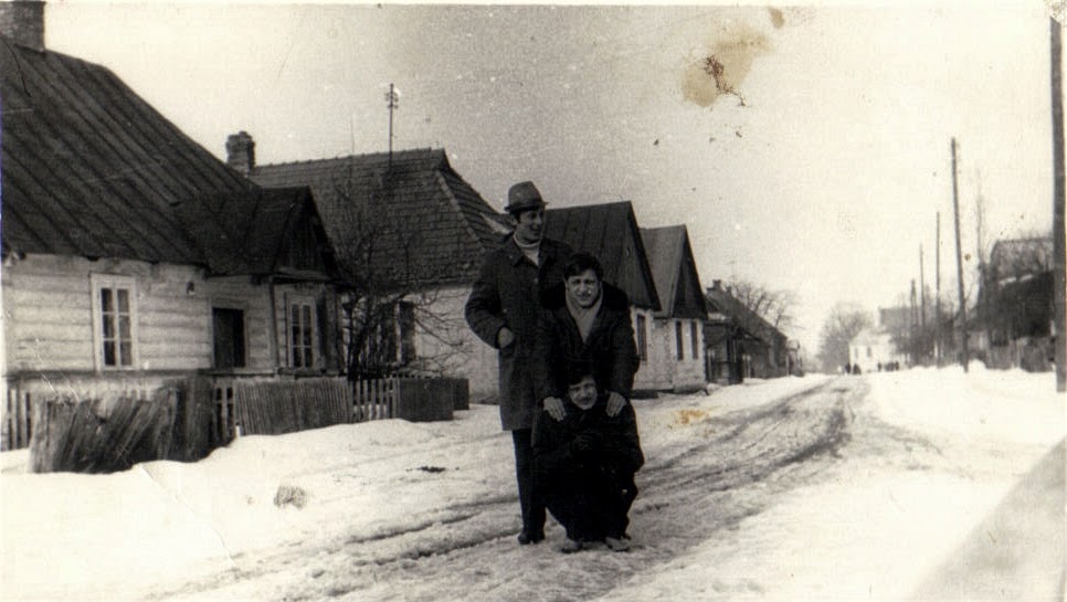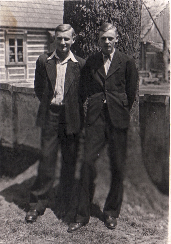 - Piotr Pachucy z prawej i Marian Pachucy na placu kościelny w tle mieszkanie Tomaszewskiego