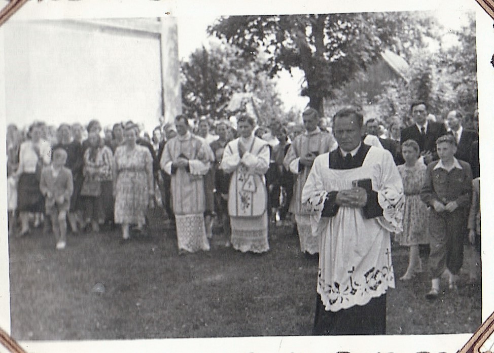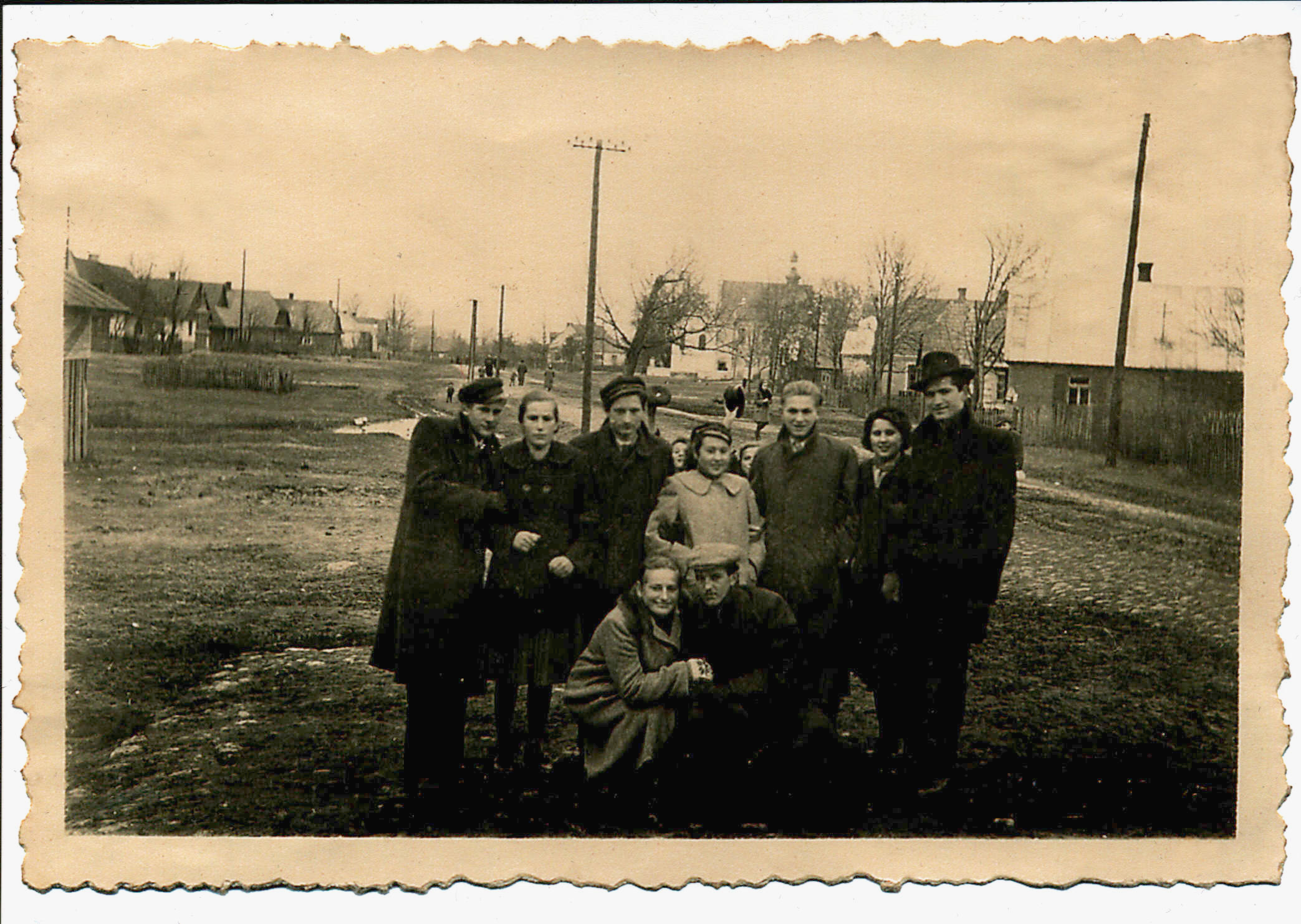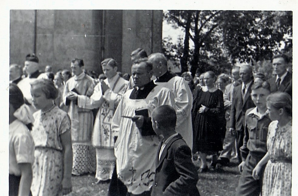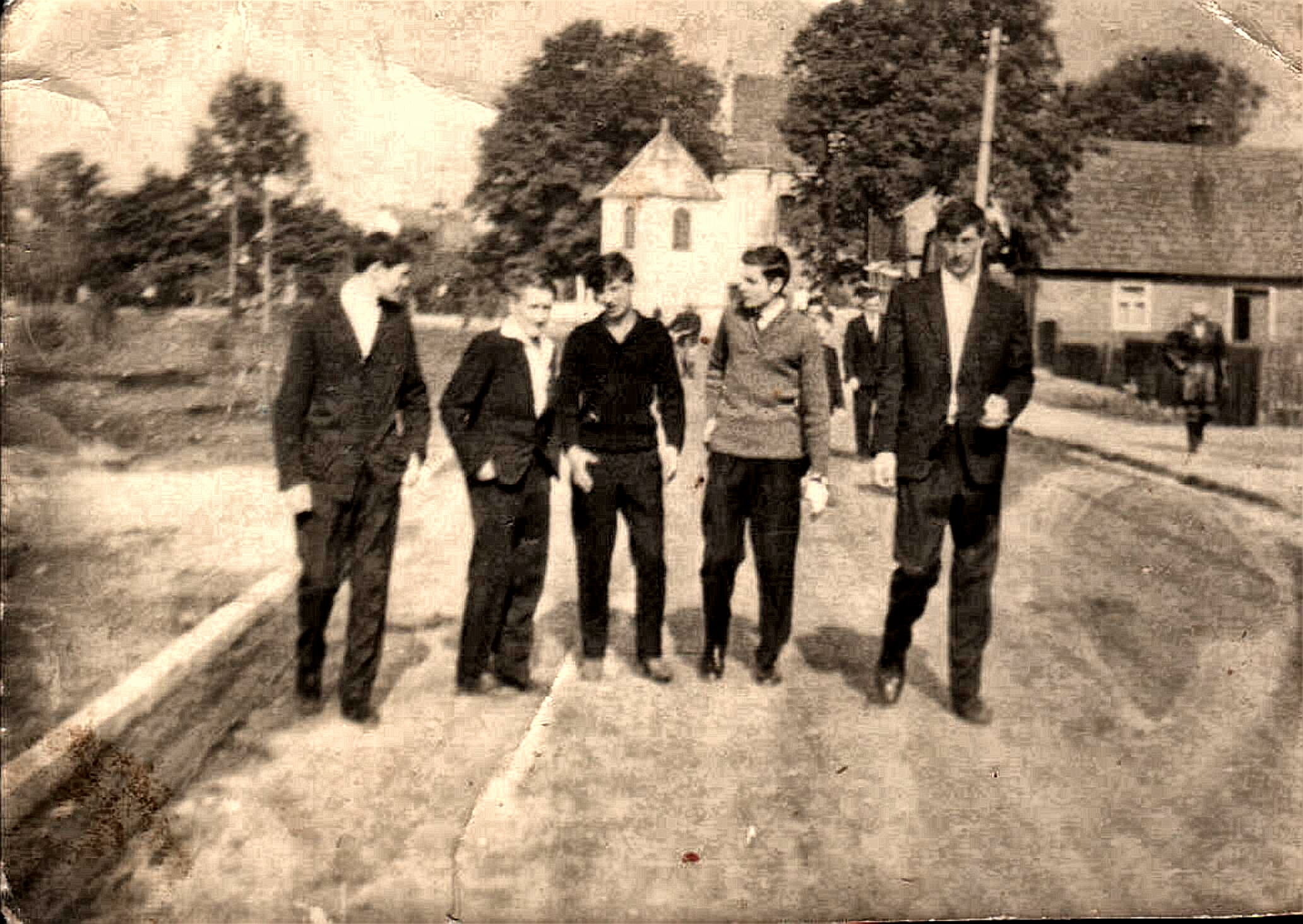 - Piotr Pachucy z prawej i Marian Pachucy na placu kościelny w tle mieszkanie Tomaszewskiego